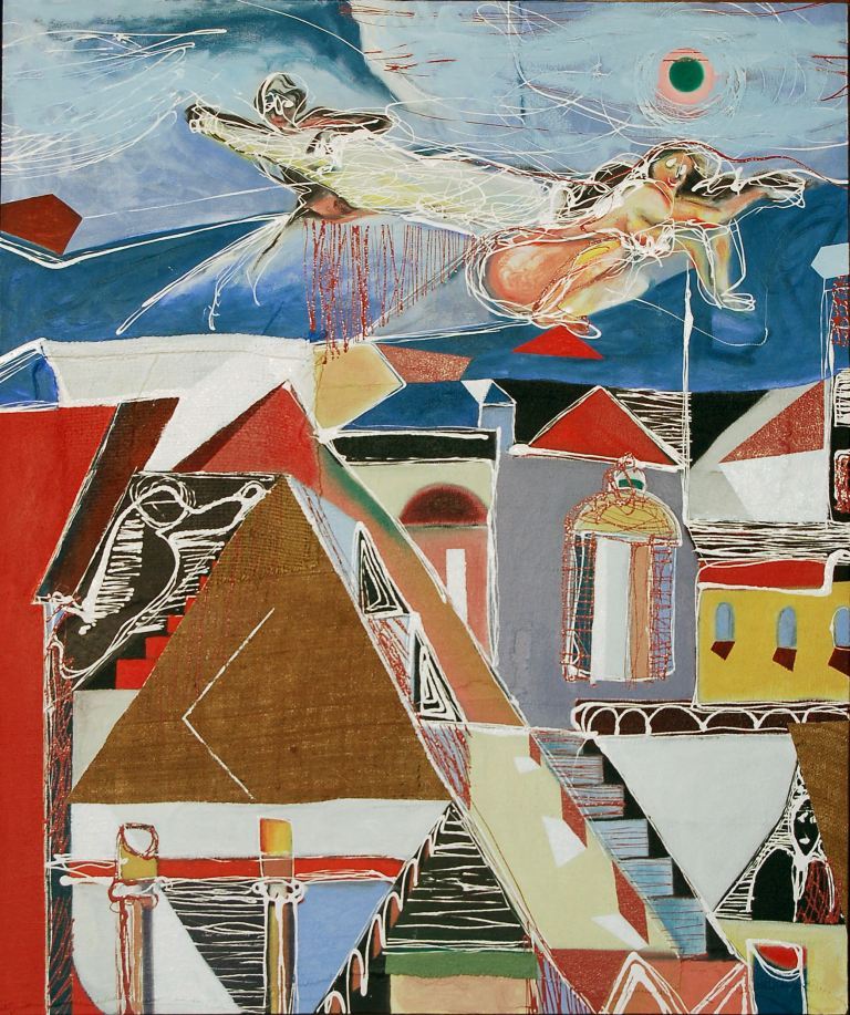 Esta serie se expuso en la ciudad de Cuenca en el año 2005 y se conformó de aproximadamente cincuenta pinturas al #óleo donde el artista destaca principalmente la figura femenina. En estas obras #Betancourt logra integrar los conceptos de ciudad y mujer. Para él la imagen de la urbe se vincula directamente con lo femenino en una analogía con la fecundidad y el crecimiento: “Las ciudades son entes vivos que crecen, dan vida, se multiplican y se desarrollan”. En estos lienzos observamos que se insinúan sutilmente siluetas femeninas que se combinan con el paisaje. Betancourt ha plasmado en sus óleos diferentes miradas de la ciudad de Quito, siempre desde un plano antropomórfico que brindan otra lectura de la capital donde sugiere lo citadino y lo femenino. Dentro de esta serie están presentes elementos que han permanecido constantes en su producción pictórica como lo son el sol y la luna, la presencia de estos símbolos son el sello inconfundible del artista. Para Betancourt la luna está asociada con la feminidad y es a la vez un elemento que se inserta muy bien en el tema urbano. Otra característica que resalta en esta serie es la línea pictórica realizada directamente con el tubo de pintura sobre el lienzo dándole de esta manera un grosor cromático particular a la misma. Todo esto influye un aire de libertad que el artista lo relaciona con el trazo caligráfico. El trazo genuino va del tubo de color de manera directa, sin una mezcla previa y sin pincel. Esta técnica brinda textura, vibración y espontaneidad a la obra. Los dos tonos predominantes en su paleta cromática han sido los azules y los rojos, componentes cromáticos característicos que generan fuertes contrastes. Miguel Betancourt ha conservado un constante andamiaje conceptual en toda su producción artística, su eje temático gira en torno a la inserción de lo antropomorfo, la naturaleza y la ciudad.